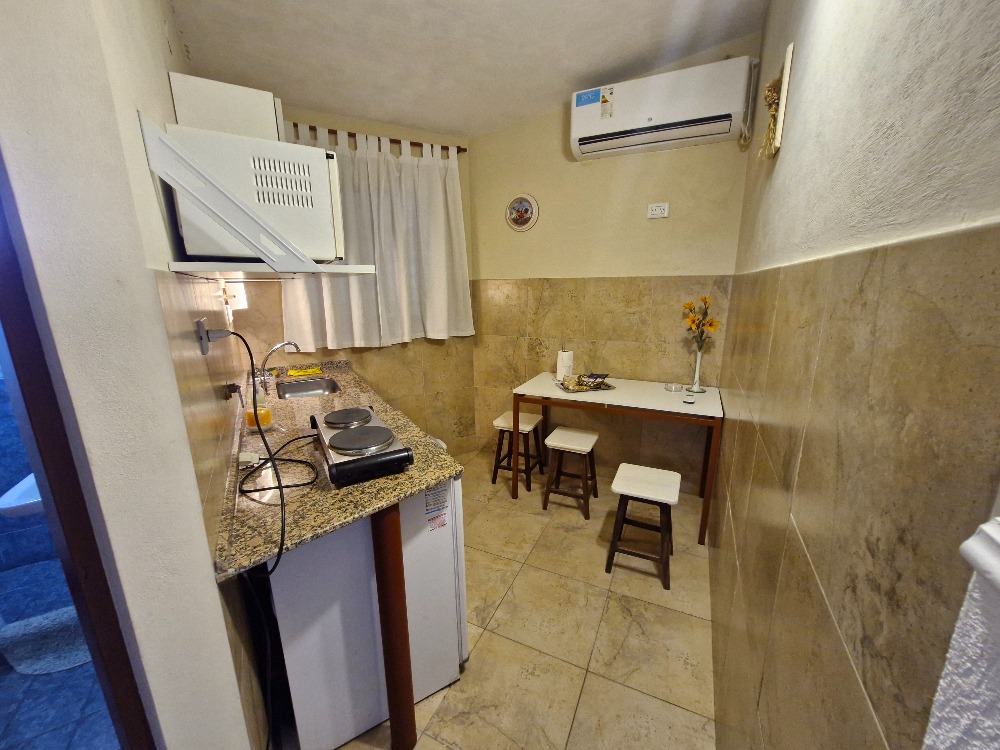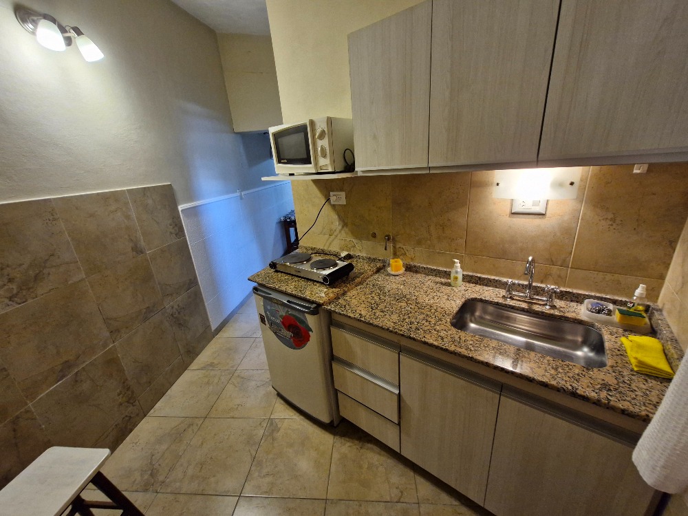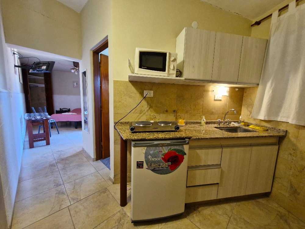 * Cocina equipada con barra, alacena, bajo mesada, microondas, heladera frigobar, pava eléctrica y cocina.
